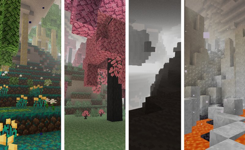 Eden transforme donc radicalement l’apparence du Nether. Cela passe donc par les couleurs. Fini le rouge omniprésent : la palette de couleurs est plus large, avec des teintes plus claires, qui tirent sur le blanc. Vous verrez également du vert, du bleu, et même du rose. Impensable en temps normal.