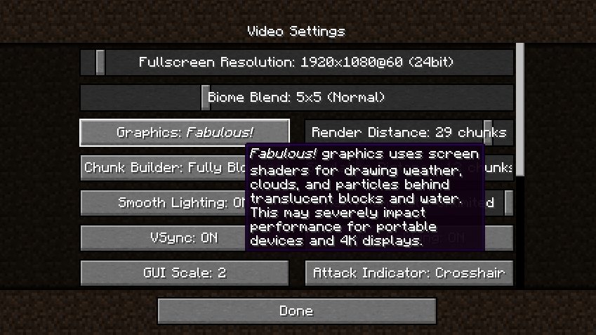 Il est à noter que pour profiter pleinement de ce pack, il est nécessaire d’utiliser les Graphismes Fabuleux (Fabulous Graphics) de Minecraft. Cette fonctionnalité permet d’activer des contours spéciaux qui sont une partie intégrante de l’esthétique du pack Element. Pour ce faire, rendez-vous dans les options vidéos et sélectionnez Fabulous.