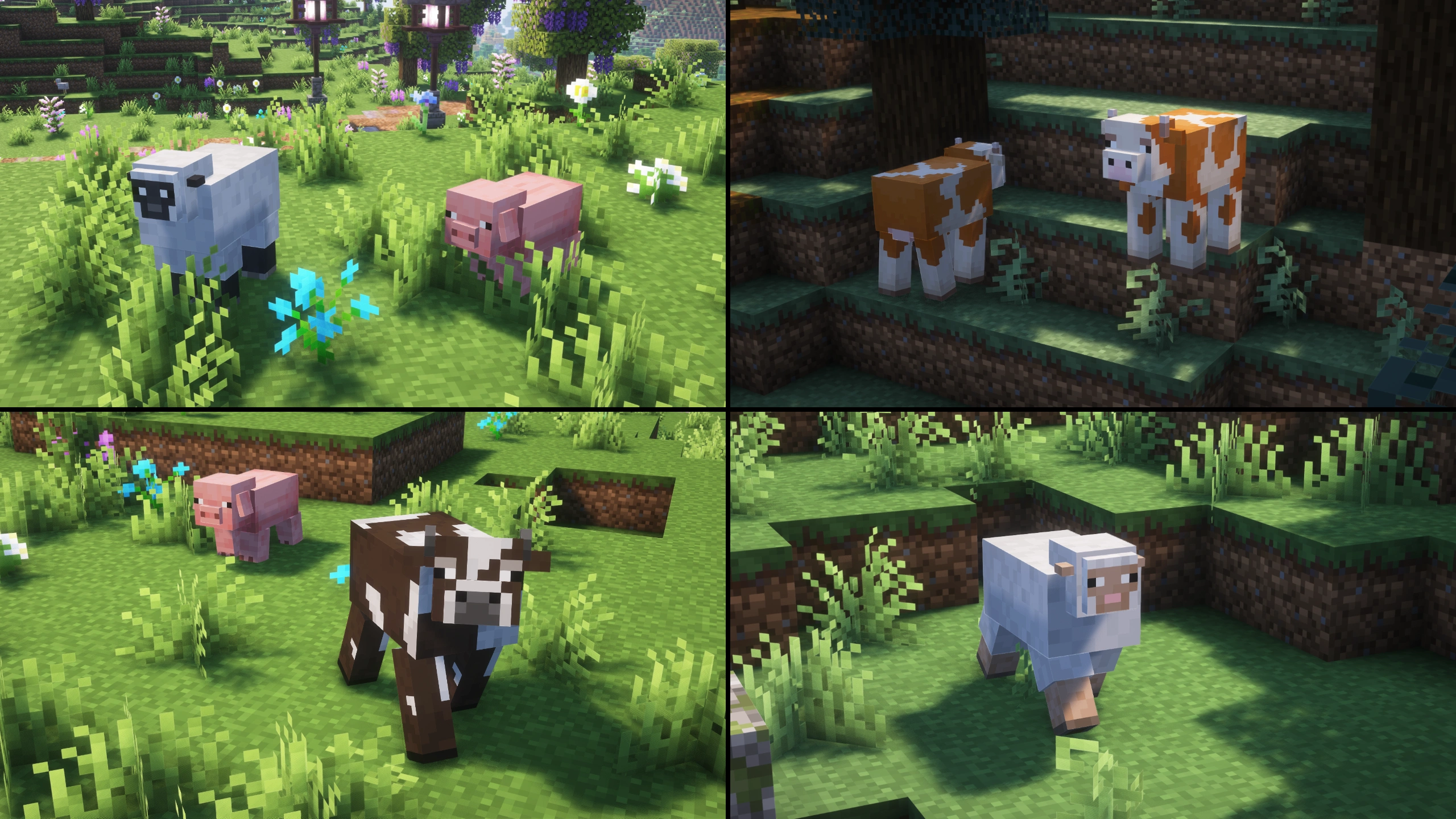 Enhanced propose aussi des variations sur les mobs. Les modèles de base sont retravaillés (vaches, moutons, cochons), avec des textures alternatives qui apportent un peu de diversité sans s’éloigner du design original.