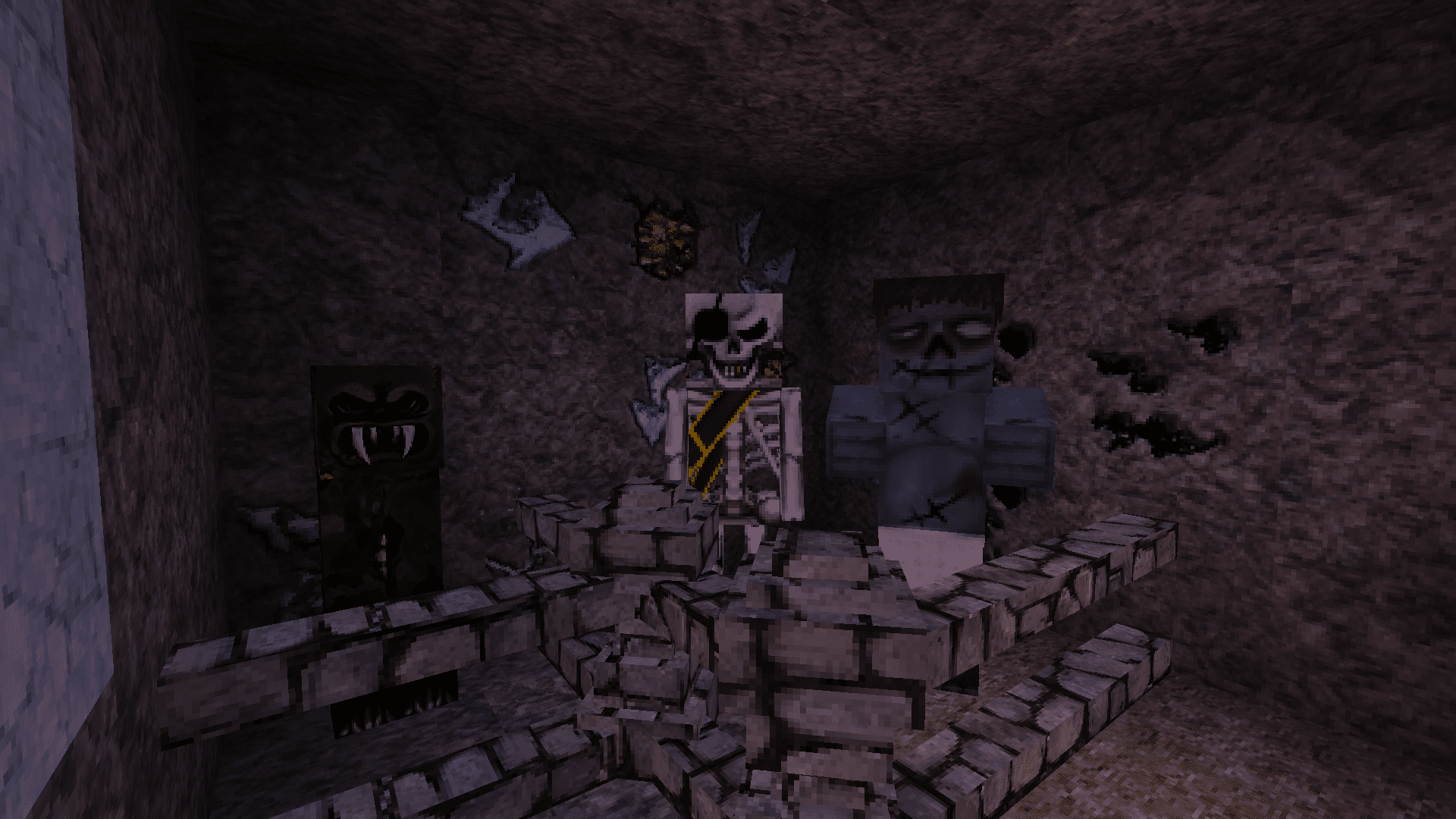 Le style cartoon, lui, irrigue tout le pack, mais surtout les items et les mobs. Les premiers arborent des textures souvent fantaisistes, tout en longueur, parfois même en démesure dans le cas de certains outils. Pour les mobs, les animaux vous regarderont avec des yeux béants, tandis que les monstres feront montre d’un style plus baroque. En témoignent les squelettes, dont certains ont même un cache-oeil. Ces modifications contribuent à conférer une atmosphère décalée au jeu. Le choix des couleurs, sans aller jusque-là, donne au moins à Minecraft un petit côté fantaisiste. Plus vives, plus éclatantes, elles rendent le jeu plus lumineux et se combinent bien au style cartoon insufflé par MeineKraft.