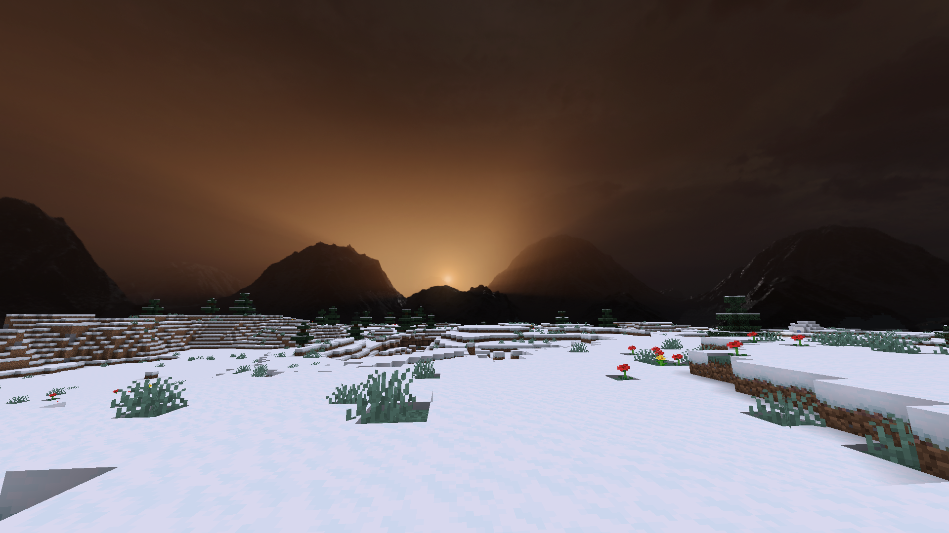 Ce pack remplace le ciel classique de Minecraft par une toile de fond composée de montagnes enneigées. Que ce soit à l’aube, en plein jour ou au crépuscule, le ciel s’adapte en permanence. On y retrouve notamment des levers et couchers de soleil spectaculaires, accompagnés d’effets lumineux évoquant les “Godrays”, ces rayons de lumière qui percent à travers les nuages.