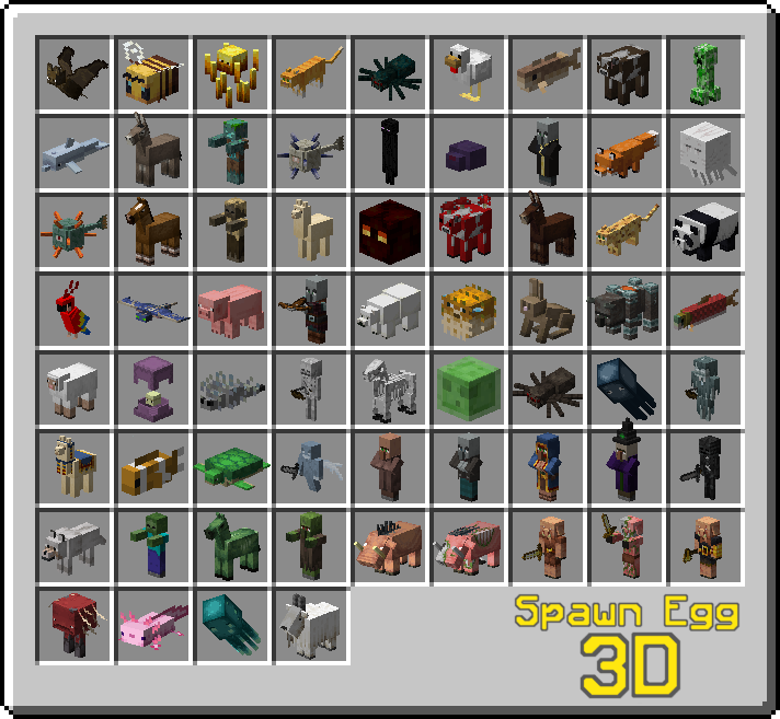 En mode Créatif, dans Minecraft, les œufs de monstres sont parfois difficiles à différencier, car le seul indicateur de la créature qu’ils renferment réside dans leur couleur. Spawn Egg 3D, créé par Vega_Senpai, cherche justement à corriger ce problème. Il le fait en remplaçant l’objet par un aperçu du modèle de la créature, autant dans l’inventaire que dans la main du joueur. Cela vous permettra donc en un clin d’œil de voir quelle créature vous pouvez faire apparaître. Il sera, en outre, possible de les mettre dans des cadres d’objet, afin de décorer différents lieux grâces à ces modèles de créature. Le tout est proposé sous forme de Resource Pack avec une résolution de 16×16, et peut être superposé à d’autres Resource Pack.