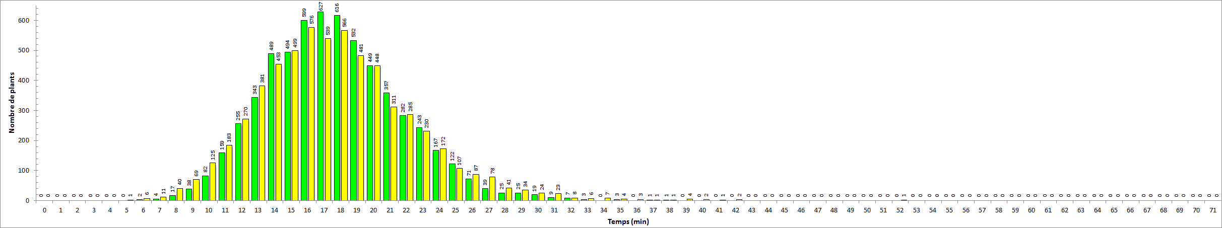 Dans le précédent TestZone, nous avions tracé la loi de probabilité associée. Si on fait de même avec nos résultats, en les regroupant par intervalle d’une minute, on retrouve encore des coubes en forme de cloche (lois gaussiennes ou loi normales) :