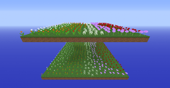 Dès qu’un bloc d’herbe haute est généré, il est remplacé immédiatement par un bloc d’air. En utilisant de la poudre d’os sur toute la surface, on finit par la remplir entièrement de fleurs.
