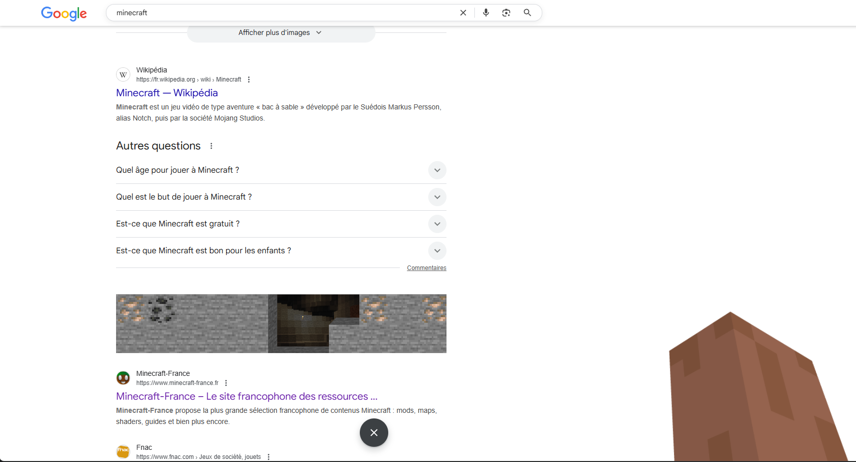 Avec ce clin d’œil, Google continue sa tradition des easter eggs inspirés de la culture geek. Après le dinosaure du mode hors connexion ou le célèbre « do a barrel roll », c’est désormais Minecraft qui s’invite dans les résultats de recherche. Une façon simple et amusante de rappeler que, même quinze ans après sa création, le jeu de Mojang reste profondément ancré dans l’imaginaire collectif.
