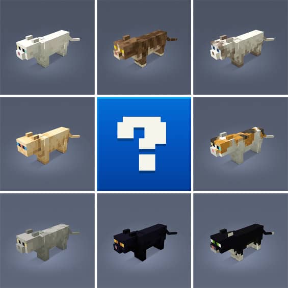 Mojang avait annoncé lors de le Minecon Earth 2018 l’ajout des chats pour la prochaine mise à jour Village & Pillage et qui seront une créature à part entière et non plus une variante de l’ocelot. Durant cette annonce, nous avons pu voir Jeb présenter les 8 chats qui ont déjà été réalisé et un dernier avec un point d’interrogation.